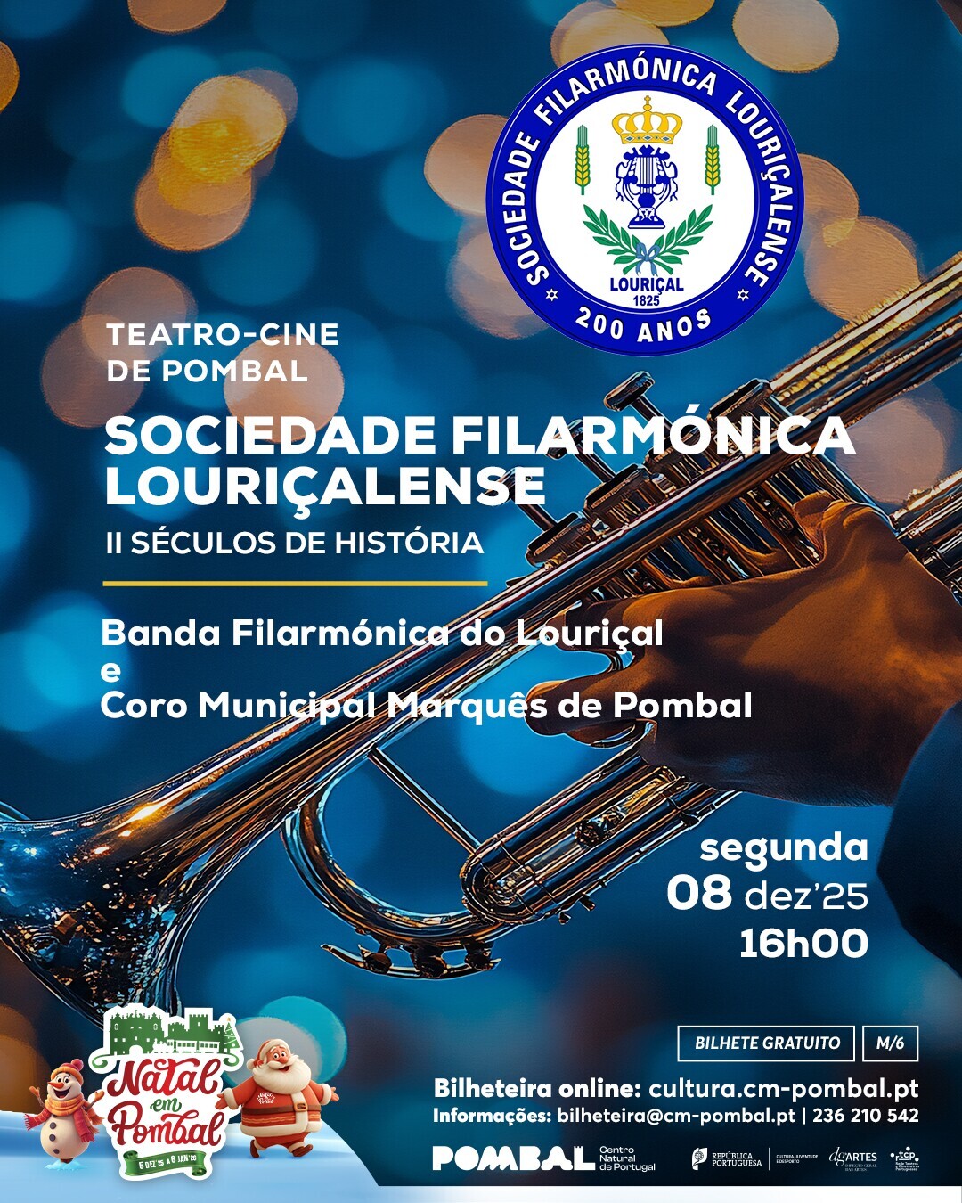 Sinopse: O espetáculo “Sociedade Filarmónica Louriçalense – II Séculos de História” é uma viagem sonora e emocional pelos 200 anos de vida da Banda Filarmónica do Louriçal, uma das mais antigas e prestigiadas instituições culturais da região. Acompanhada pelo Coro Municipal Marquês de Pombal, esta apresentação única funde o poder da música instrumental e coral num programa que evoca as memórias, as gentes e os momentos que moldaram a identidade de uma coletividade que atravessou gerações. Entre sons, vozes e imagens, o público será convidado a revisitar a história viva da Sociedade Filarmónica Louriçalense - um património que continua a inspirar e a unir a comunidade através da arte e da música.